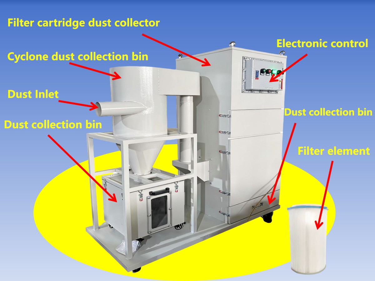そのコア技術は、遠心力を利用して空気から大きな粉塵粒子を分離し、カートリッジ集塵機によって正確に濾過され、濾過精度 3μm ~ 5μm のきれいな粉塵が得られます。